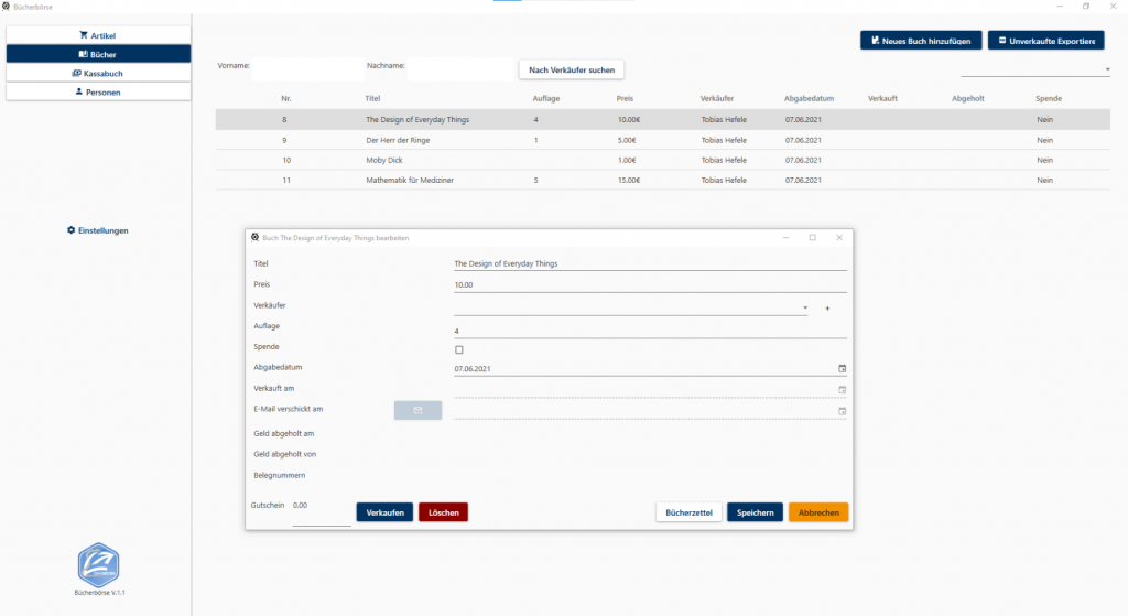Das System bietet diverse Filter, mit denen die relevantesten Informationen mit wenigen Klicks angezeigt werden können. Außerdem werden automatisch sog. “Bücherzettel” generiert, die die Student:innen unterschreiben können, wenn sie ein Buch zum Verkauf abgeben.