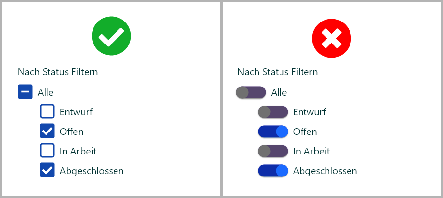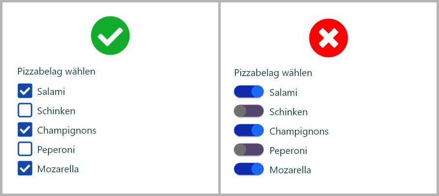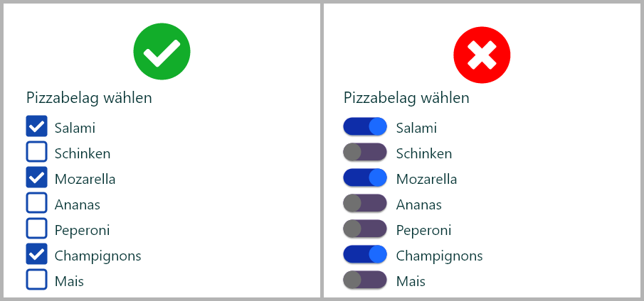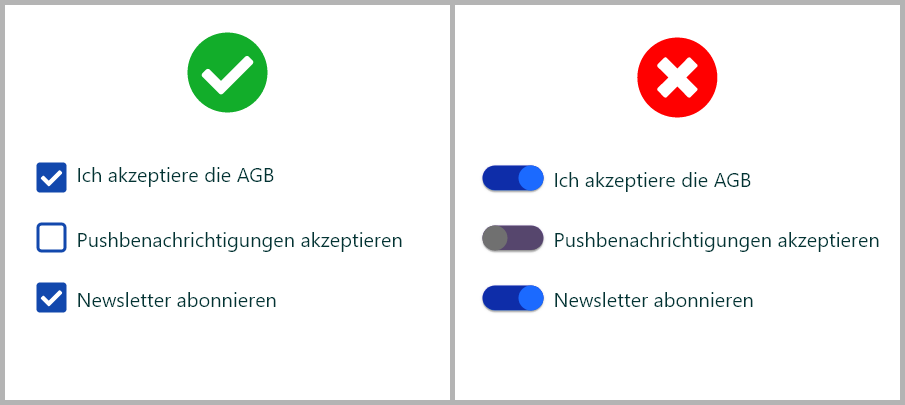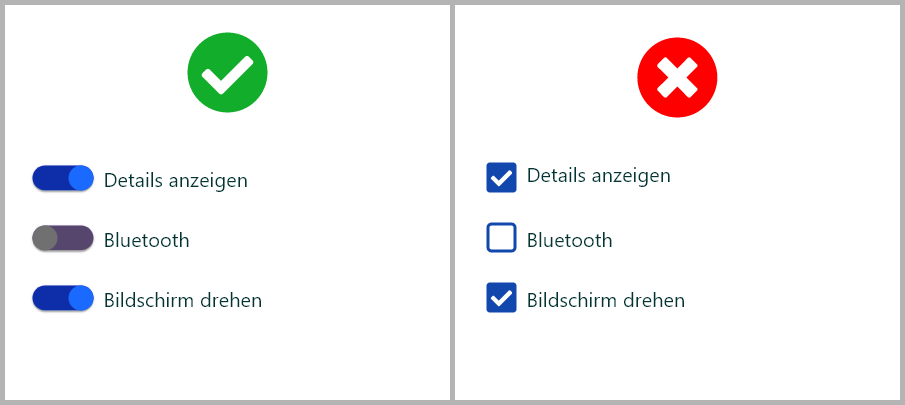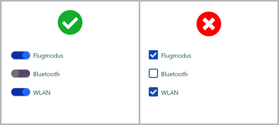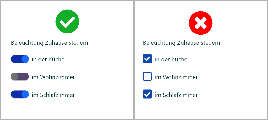 Bei ähnlichen Optionen gilt es sich wieder ins Gedächtnis zu rufen, was die zwei entscheidenden Unterschiede zwischen Toggles und Checkboxen ist: die Anzahl der Status (3 bei Checkboxen, 2 bei Toggles) und die Auswirkung der Selektion (Statuswechsel bei Checkboxen, Statuswechsel samt automatischer Ausführung impliziter Aktionen bei Toggles).