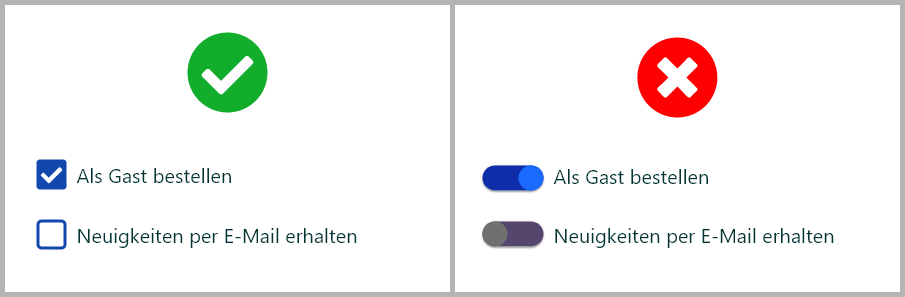 Eigenständige Bedienelemente, die während der Interaktion nicht zur automatischen Ausführung von Aktionen führen, sollten immer als Checkbox dargestellt werden.